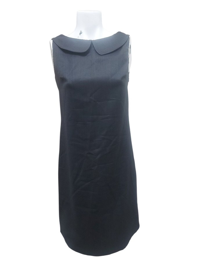 Siyah, kolsuz, midi boy kalem elbise, yakalı ve regular fit. Sentetik kumaştan, minimalist ve gotik tarzda, ofis için uygun. Hiç giyilmedi