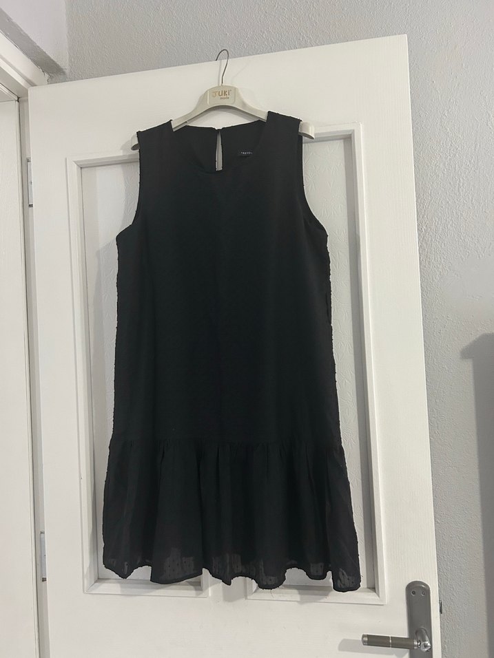 Siyah kolsuz midi elbise, keten kumaştan, salaş kesim ve yuvarlak yaka ile etek kısmında fırfır detayına sahiptir.