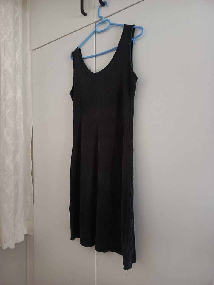 Keten kumaştan, kolsuz, V yakalı ve salaş kesimli siyah midi elbise. Minimalist gotik tarzıyla günlük kullanıma uygundur.