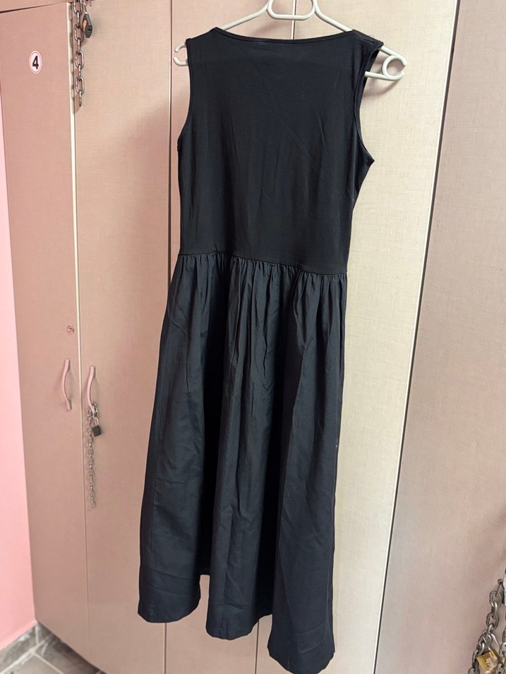 Siyah kolsuz midi keten elbise, bol kesim ve drapeli tasarıma sahiptir. V yaka ve minimalist stilde, günlük kullanıma uygundur.