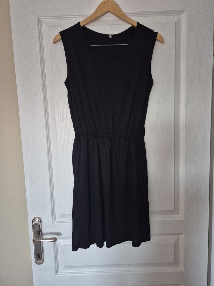Siyah Kolsuz Midi Keten Elbise