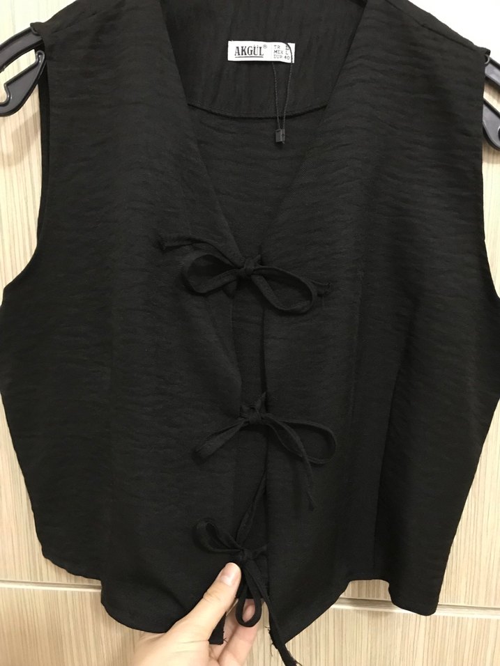 Siyah kolsuz keten yelek, halter yakalı ve bol kesimlidir. Önde bağcık detayıyla gotik tarz sunar. 40 yazıyor ama m bedene olur Hiç kullanmadım Sorunsuz #yelek #ceket #kısagömlek #kısayelek #kısaceket