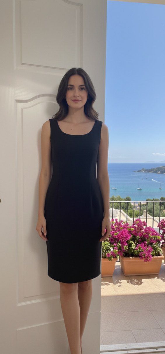 Kolsuz, V yakalı siyah midi elbise, klasik zarafet ve çağdaş stil ile ofiste şık ve rahat bir görünüm sunar.