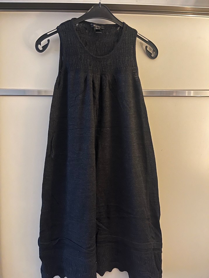 Kolsuz, siyah triko elbise, bol kesim tasarıma sahip. Yuvarlak yaka ve midi boy, günlük kullanım için uygun. Hiç kullanılmadı