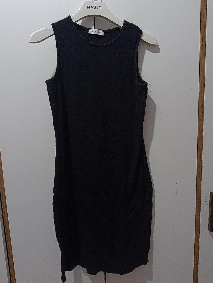 Siyah, kolsuz, midi boyda triko elbise, bisiklet yaka ve vücuda oturan kesime sahiptir. Düz, minimalist ve şehir stiline uygun, günlük kullanıma elverişlidir. Marka HAVin'dir.