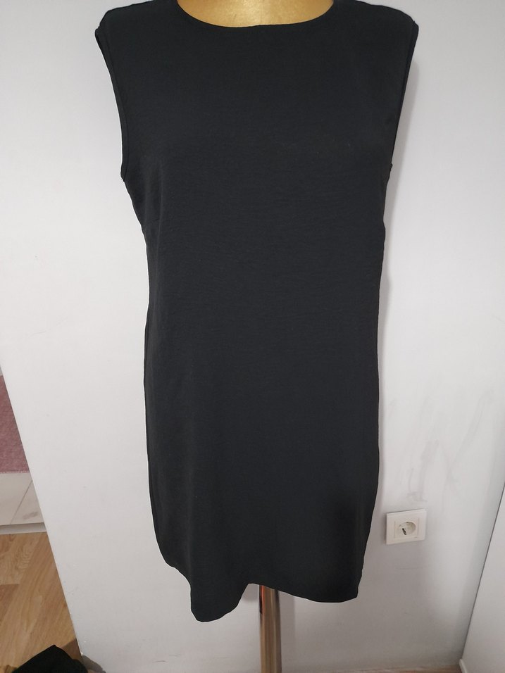 Siyah kolsuz, bisiklet yaka triko elbise, normal kesim ve midi boydadır. Yumuşak sentetik kumaştan üretilmiş olup, gündelik kullanım için minimalist ve desensiz tasarıma sahiptir.