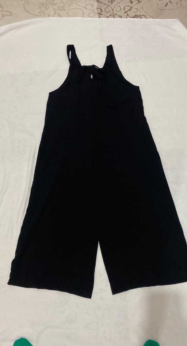 Yüksek yakalı, kolsuz ve bol kesim siyah midi tulum. Yumuşak sentetik kumaştan, sade ve şık tasarımıyla günlük sokak stiline uygundur. İki kol arası 46cm, boy 119cm , hiç kullanılmadı