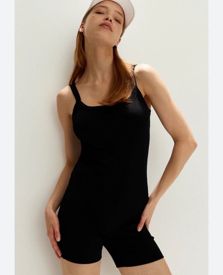 Kolsuz, düz yakalı siyah mini tulum, sentetik kumaştan üretilmiş, sportif ve şık bir görünüm sunar. Cesur ve sokak stiline uygun. Vücudu sarar. Bedene Oturan Tulum siyah.