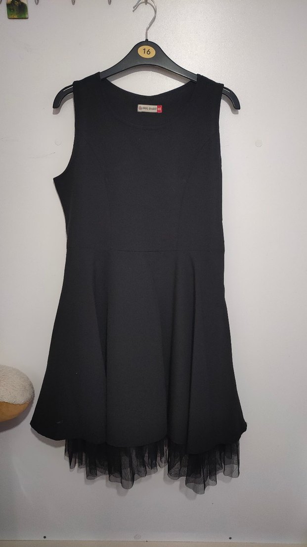 Kolsuz, siyah midi elbise, yuvarlak yaka ve etek ucu fırfır detaylarıyla gotik stil sunar. Trend belirleyiciler için avant-garde ve şık bir seçim.