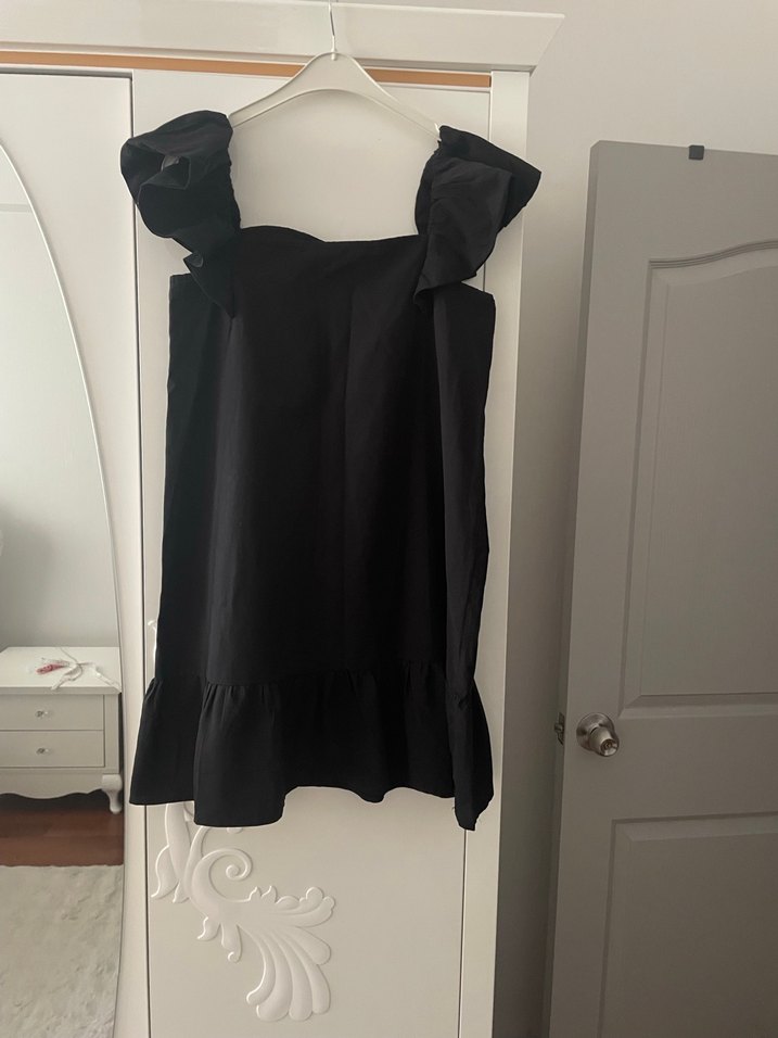 Siyah kolsuz mini elbise, straplez yaka ve fırfır detaylara sahiptir. Keten kumaştan, rahat kesimli ve günlük kullanım için uygundur. Minimalist ve avangart stil arayanlar için ideal. 38 40 beden uyumlu keten elbise