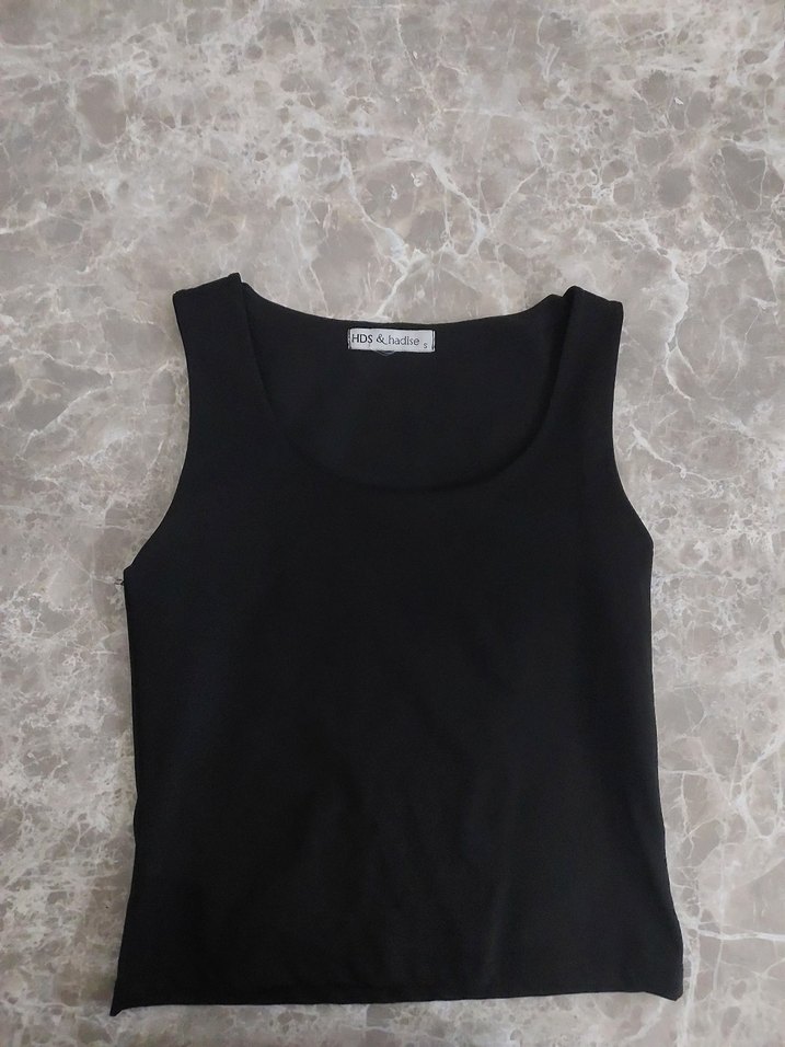Siyah renkte, kolsuz ve kısa kesim kadın atlet. Tek renk ve sade tasarımıyla günlük kullanım için uygun, yumuşak ve sıcak dokulu kumaştan.