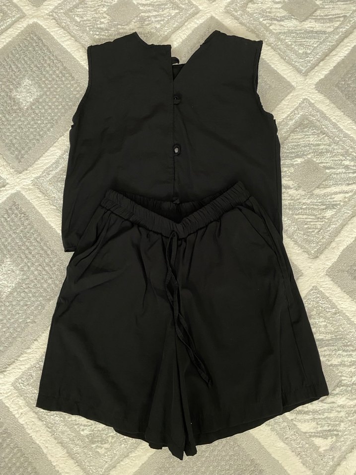 Nefes alabilen keten kumaştan, rahat kesim ve V yaka detaylı siyah kolsuz mini tulum, günlük kullanıma uygun.