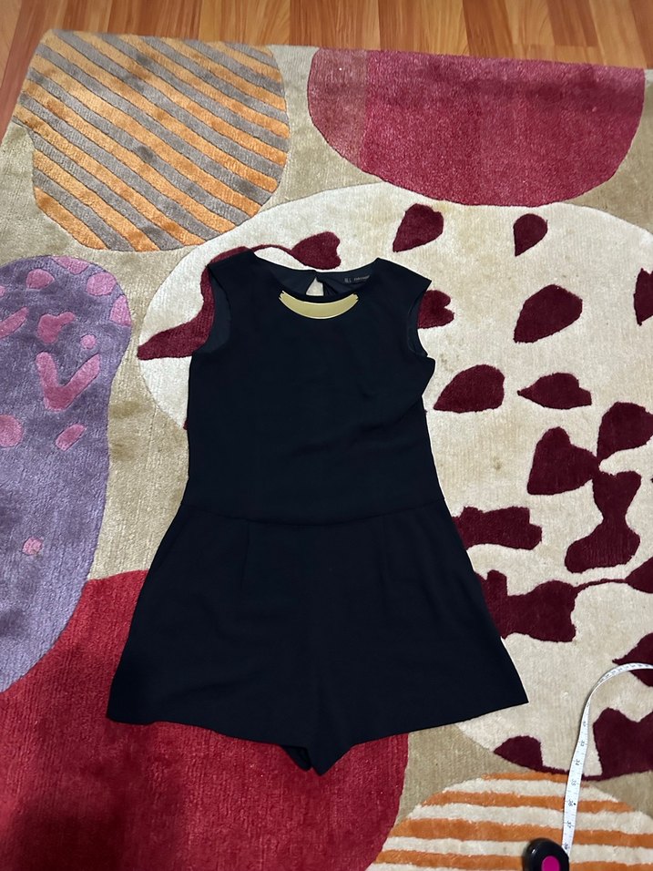 Kolsuz, siyah, kısa boy tulum, yuvarlak yaka ve sentetik kumaştan. Minimalist tasarımıyla rahat ve şık, günlük ve parti kullanımı için uygun.