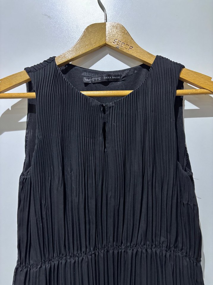 Keten kumaştan, kolsuz ve V yaka uzun siyah elbise. Piliseli detayları ve dar kesimiyle minimalist gotik tarzı yansıtır. Ofis için uygundur.