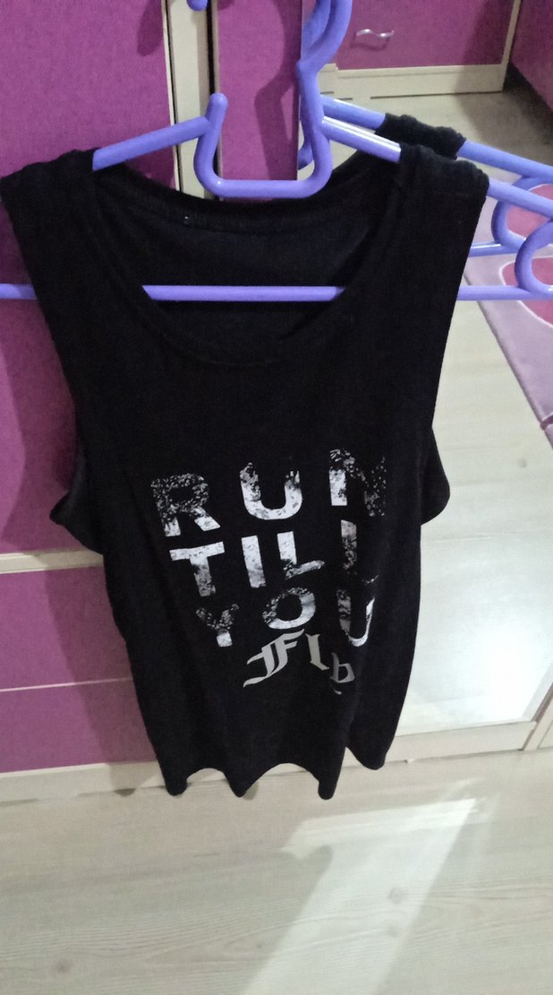Siyah kolsuz pamuk tişört, bol kesim ve baskılı rock punk tarzıyla, fırfır detaylı, günlük kullanım için uygundur.