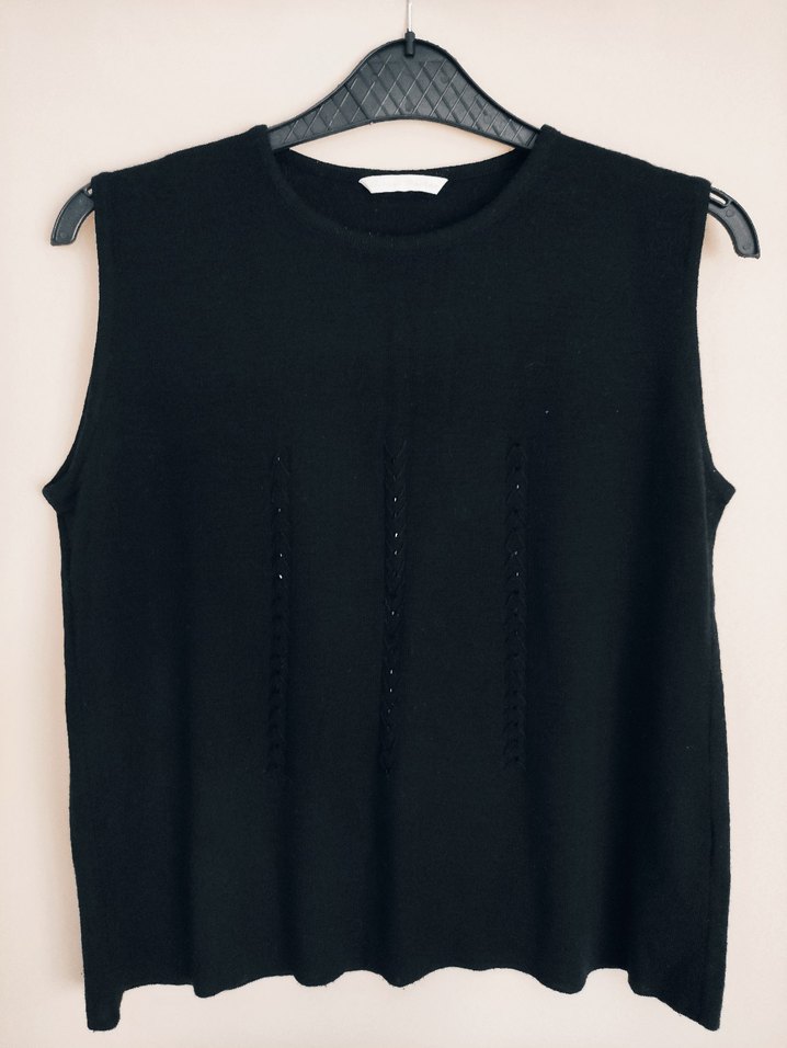 siyah kolsuz saç örgülü ve boncuk işlemeli triko pamuklu esnek çok kalın değildir iç göstermez harika kalitede XL çin uygundur boyu 60 kol alttan eni 55.. az kullanıldı temiz sorunsuz birgül hoskan