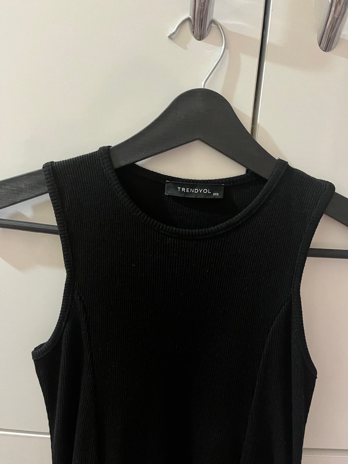 Kolsuz, bisiklet yaka ve midi boyda siyah triko elbise. Sentetik kumaştan, şık ve rahat bir görünüm sunar. Günlük kullanım için uygundur. Bedeni xss