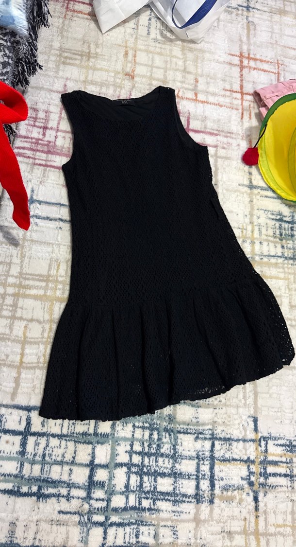 Siyah kolsuz triko elbise, bol kesim ve fırfırlı etek ucu ile gotik ve Paris tarzı sunar, yuvarlak yakalıdır. Günlük kullanıma uygundur.