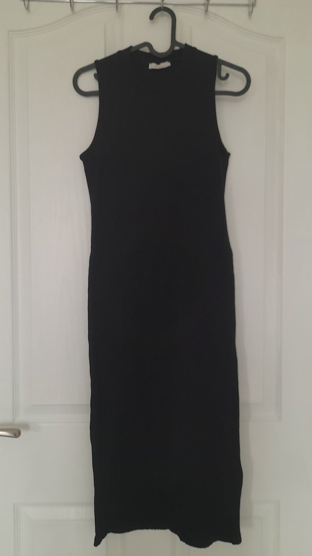 S beden ancak l bedene kadar uyabilir. Kolsuz, yüksek yakalı ve dar kesim siyah uzun elbise. Düz, minimalist goth tarzını yansıtan sentetik kumaştan üretilmiştir. Günlük kullanıma uygundur.