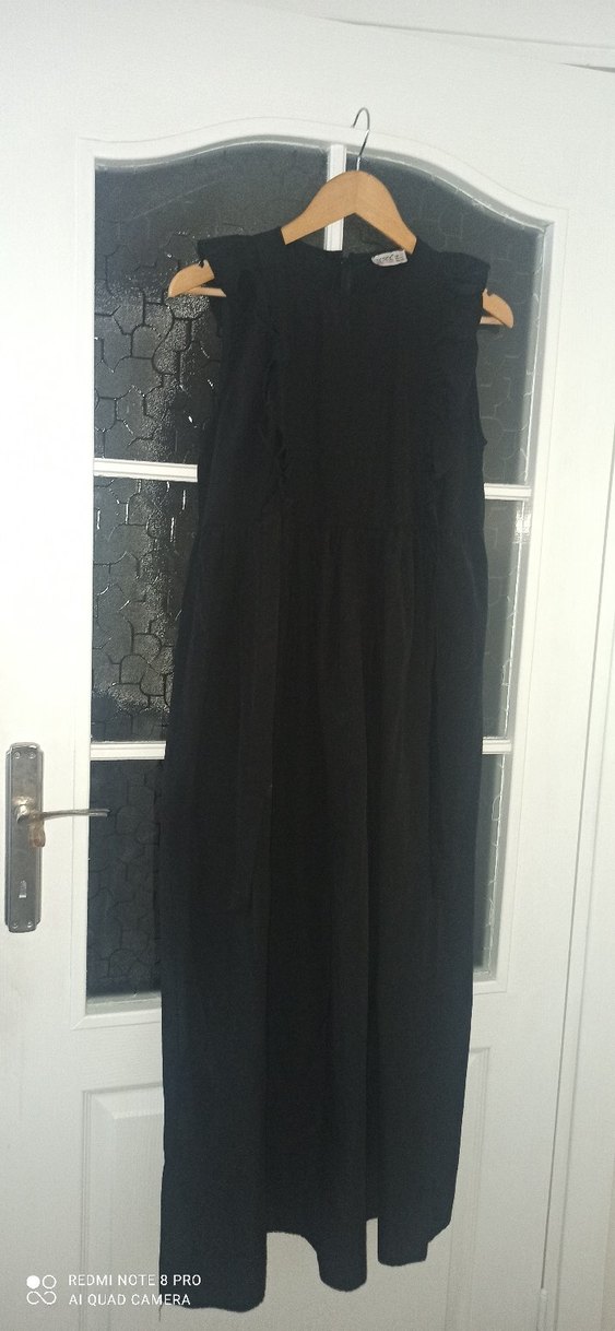 Siyah kolsuz uzun elbise, yüksek yakalı kumaştan, drapeli ve bol kesimlidir. Ofis için gotik tarzda uygundur. arkadan bağlamalı
