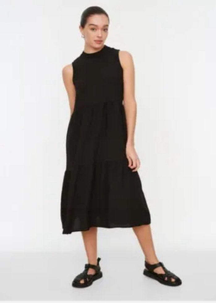 Siyah kolsuz, yüksek yakalı ve bol kesim keten elbise, fırfır detaylıdır. Minimalist sokak stili ve günlük kullanıma uygundur.