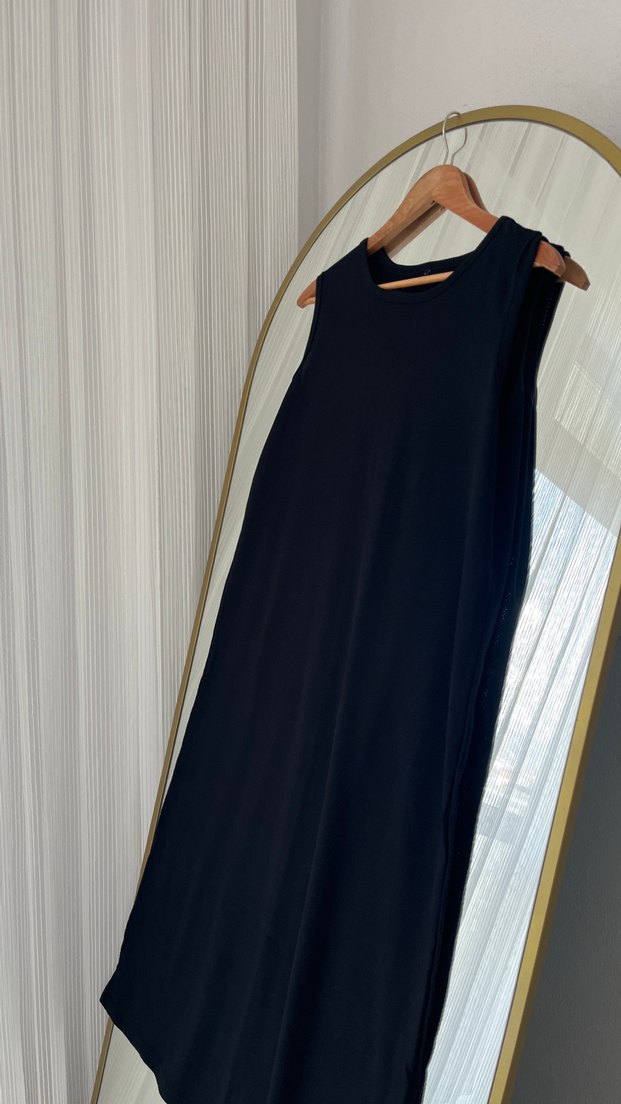 Siyah uzun kolsuz elbise. Rahat kesim ve yumuşak sentetik kumaştan üretilmiştir, minimalist ve şık bir görünüm sunar.Beden ve renkleri mevcuttur.