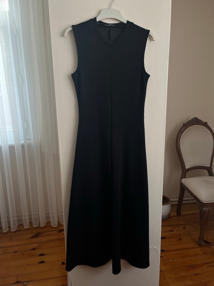 Sade ve şık siyah kolsuz uzun elbise, oturan kesim ve yuvarlak yakaya sahip. Ofis kullanımı için uygun minimal tasarım. Hiç kullanılmadı. Kendime yakıştıramadığım için satıyorum.