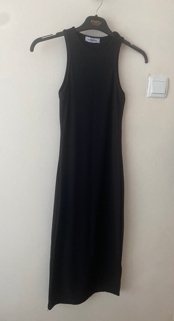 Yüksek yakalı, kolsuz, vücuda oturan siyah uzun elbise, yumuşak sentetik kumaştan. Minimalist ve şık, günlük kullanım için uygundur.