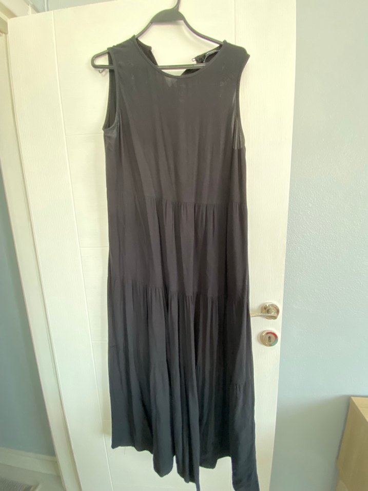 Kolsuz, bol kesim ve pile detaylı uzun elbise, yumuşak keten kumaştan. Siyah renk, yuvarlak yaka ve minimalist normcore tarzda, günlük kullanıma uygun. Hafif iç gösteriyor iki kere giyildi kolaltında deodorant izi var sadece göğüs:53 cm boy:130 cm