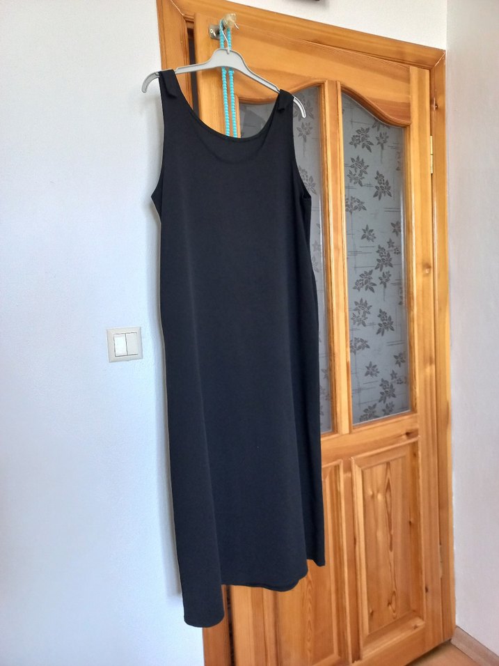 Siyah kolsuz örme elbise, bol kesim ve drapeli tasarıma sahiptir. İpek gibi yumuşak kumaştan üretilmiş, sade ve minimal stil sunar.
