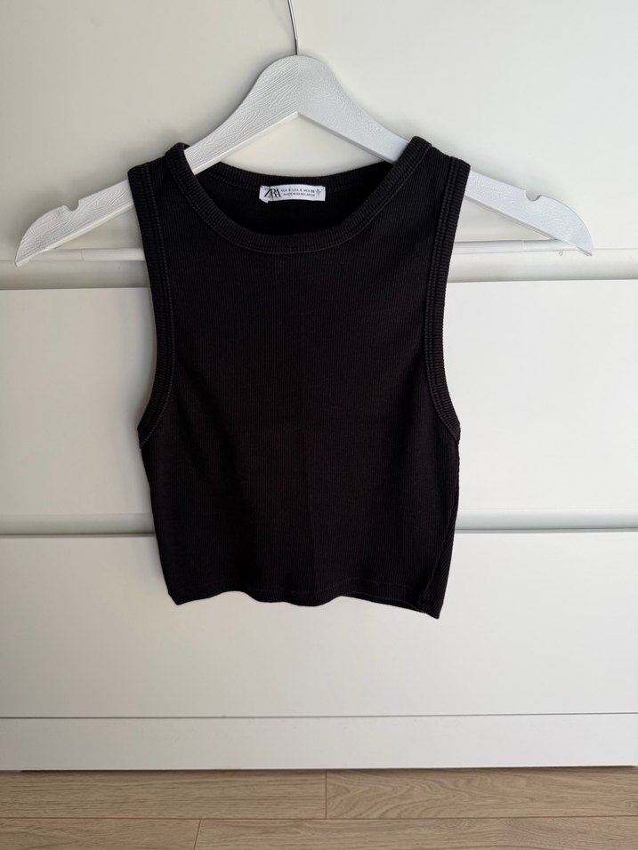 Yüksek yakalı ve kısa boylu siyah, vücuda oturan kolsuz crop top. Günlük rahatlık için ideal.