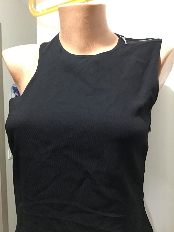 Siyah kolsuz, yüksek yakalı kalem elbise, fermuarlı detaylıdır. Midi boy ve minimalist tasarımlı, ofis için uygun goth tarzında şık bir seçimdir.