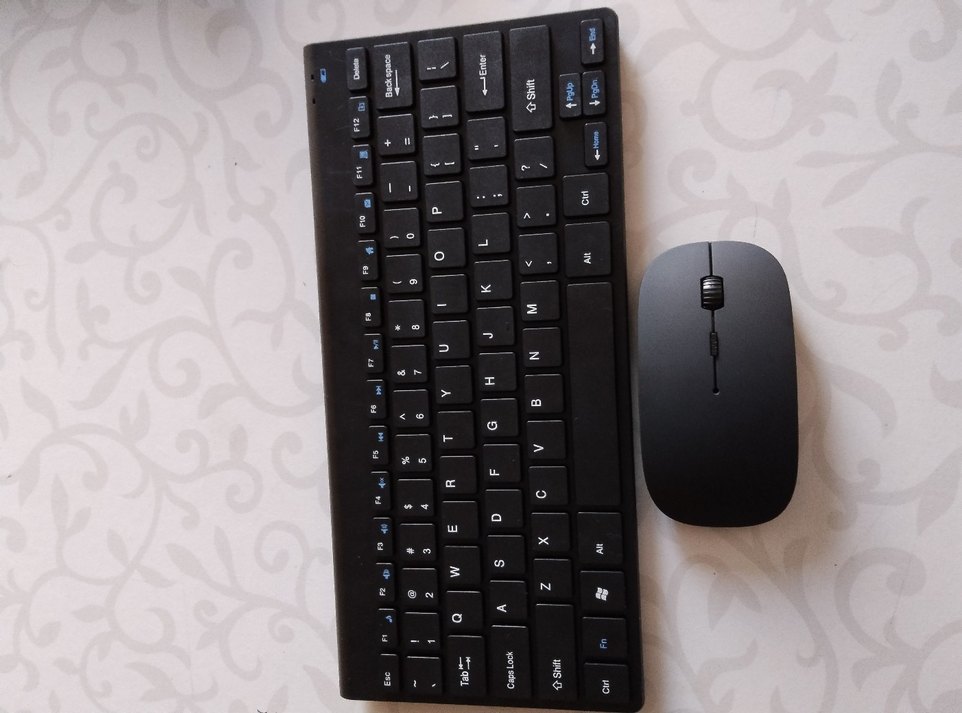 Mavi fonksiyon sembollü koyu tuşlara sahip siyah kompakt kablosuz klavye ve siyah kablosuz fare. ️