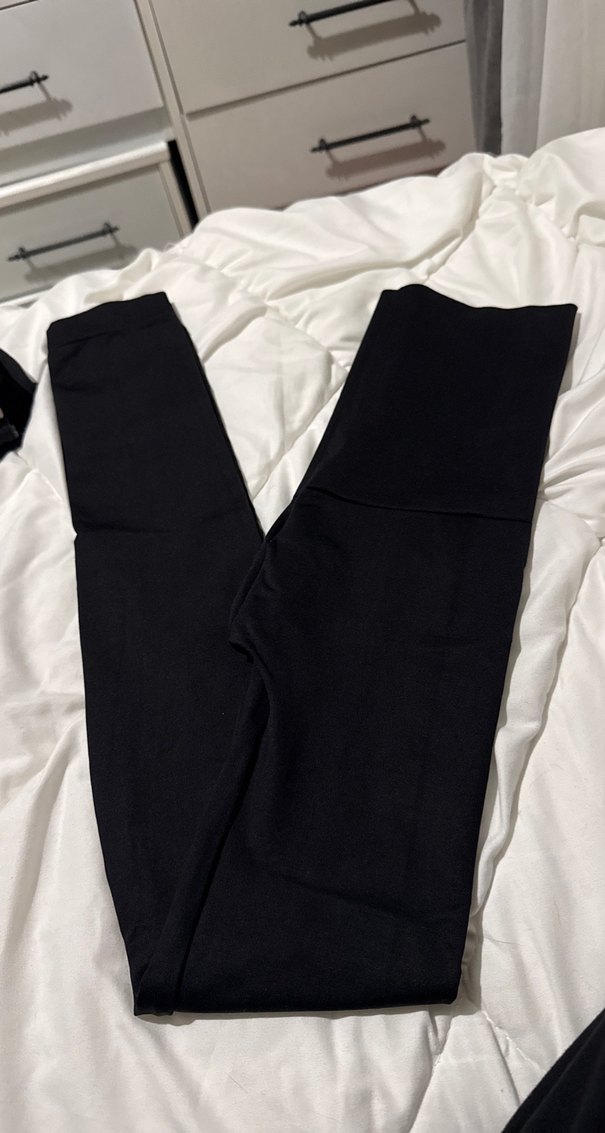 Düz siyah, midi boy, kadın tayt. Rahat sentetik kumaştan, günlük sokak giyimine uygun.
