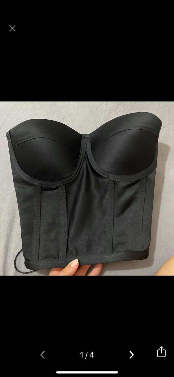 Siyah, straplez, korse tarzında, kemerli ve kısa uzunlukta mini bustiyer. Sentetik kumaştan, gotik stil ve askılı kollara sahip.