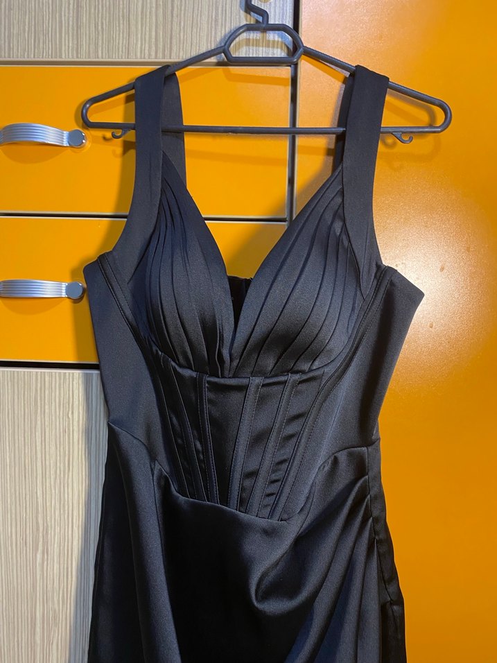 Siyah, V yakalı, drapeli detaylara sahip, askılı ve uzun kesim fitted abiye elbise gigiis markasına ait bir kaç saat giyildi sonrasında kuru temizlemesi yapıldı