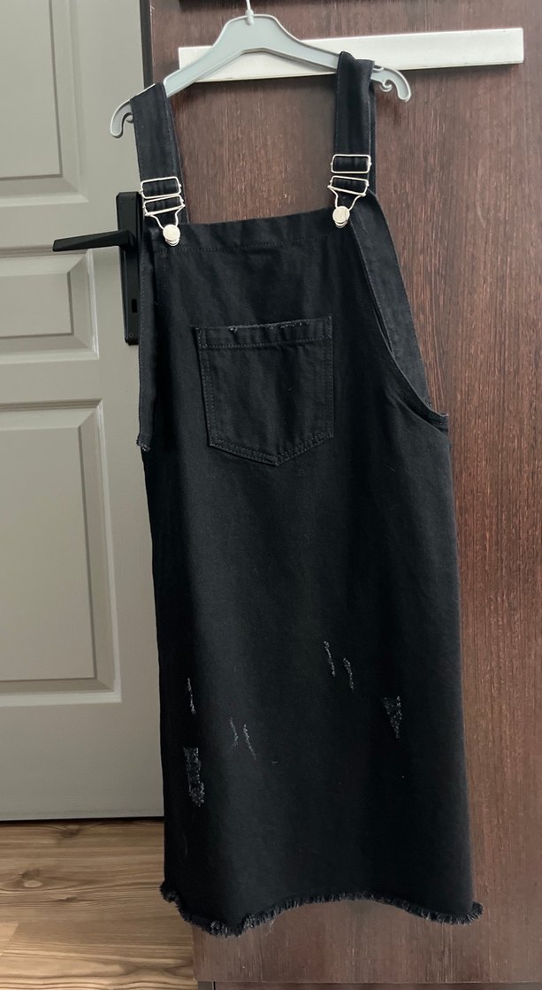 Siyah kot kumaştan, askılı, bol kesim midi tulum. Straplez yaka ve ön cep detaylı, günlük kullanım için uygun. Boyu ayarlanabilir