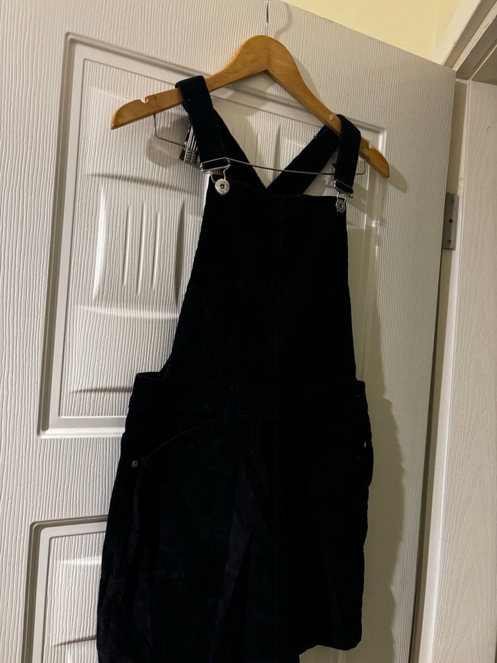 Siyah, kot kumaştan yapılmış, askılı ve tokalı bantlara sahip, goth tarzında kız çocuk tulumu. Desensiz ve vücuda oturan kesim.