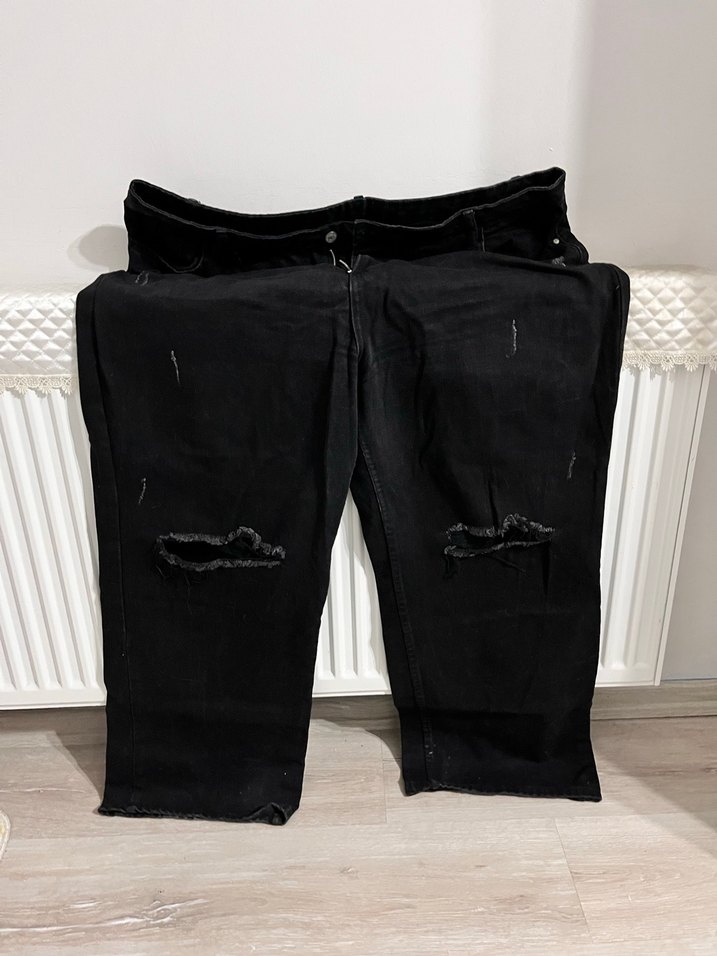 Siyah kot kumaştan, rahat kesim ve normal boyda erkek pantolonu. Bel detaylı, sokak stili ve günlük kullanıma uygun.