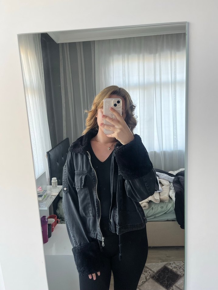 Siyah kot ceket, kürk detaylı yaka ve manşetlere sahiptir. Yüksek yakalı, uzun kollu ve bol kesimdir. Midi boyda, günlük kullanıma uygundur. Omzundan ve alttan bir düğmesi kopuk ekledim zaten görsellerini.