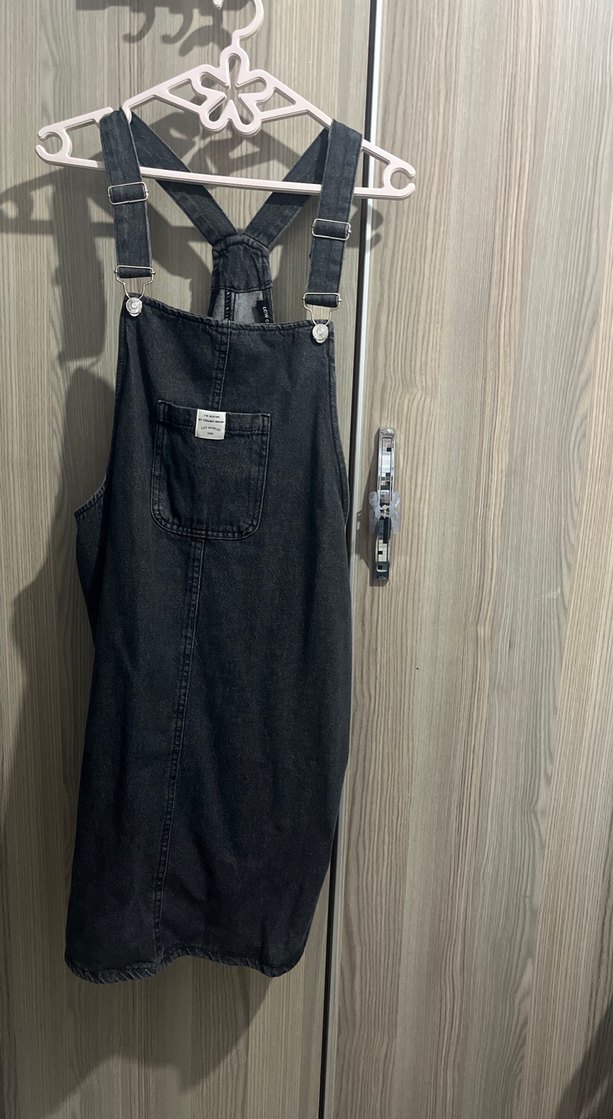 Siyah kot midi tulum, bol kesim ve askısız tasarımla, bel kemeri ve ön cep detaylıdır. Günlük sokak stili için uygundur.