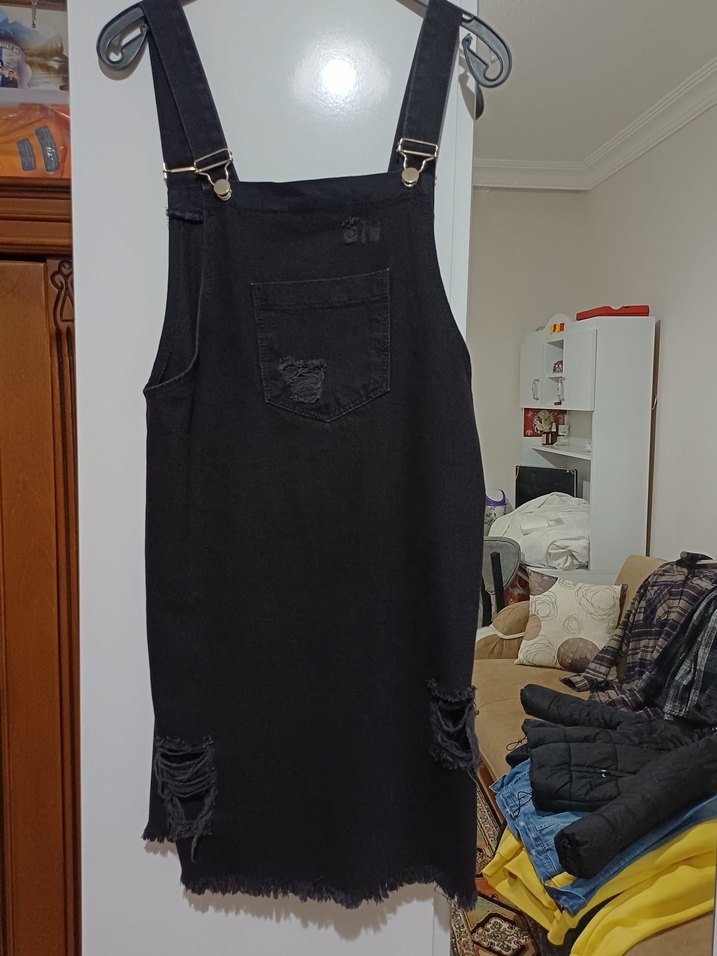 Siyah kot midi uzunlukta, bol kesim ve tokalı askılı tulum. Bisiklet yaka ve yırtık detaylı, günlük rahat kullanım için uygun. 2 kez kullanıldı hiçbir sorunu yok