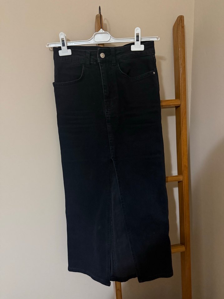 Siyah kot kumaştan, midi boy etek. Günlük kullanıma uygun, desensiz ve koyu renkte.