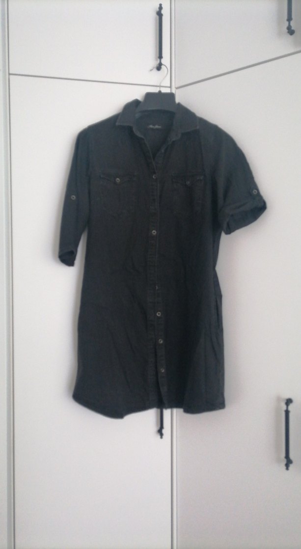 Siyah kot kumaştan, yakalı ve kısa kollu midi gömlek elbise. Düğmeli ve bol kesim, günlük sokak stiline uygun.