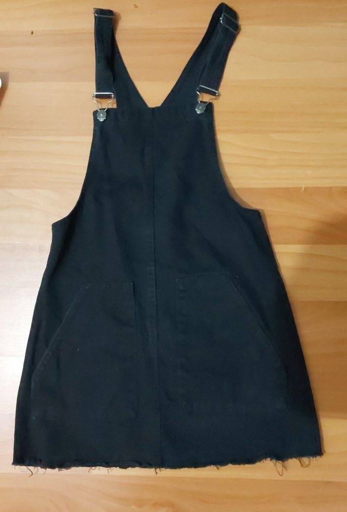 Siyah kot kumaştan, askılı ve tokalı bantlara sahip, bol kesim mini tulum. Yüksek yakalı, günlük sokak stiline uygun.