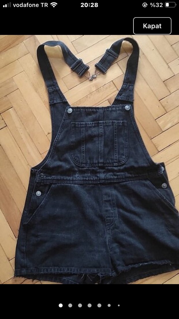 Siyah kot mini salopet, halter yaka ve tokalı askılarla. Bol kesim, desensiz, gündelik sokak tarzına punk dokunuşu.