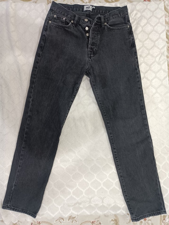siyah renkli, düğmeli ön kapamalı erkek denim pantolon, normal boy ve regular fit kesime sahiptir. Günlük ve sokak stili için uygundur. bel 38 cm boy 102cmdir