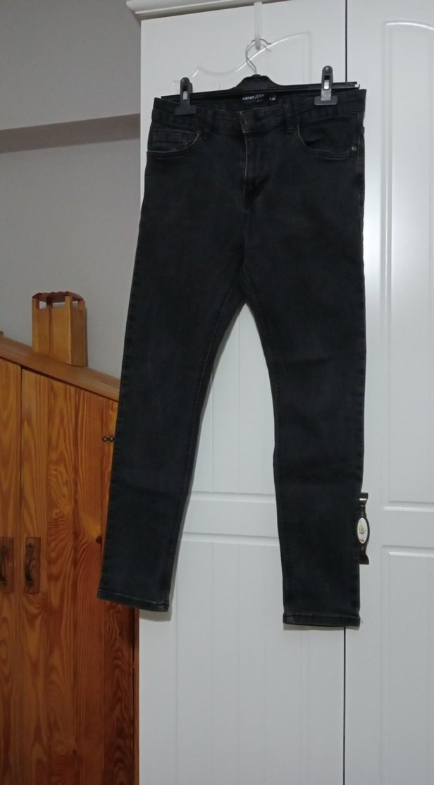 Siyah kot kumaştan pantolon, kemerli ve normal boyda. Günlük rahat kullanım için uygun, desen içermeyen sokak stili pantolon.