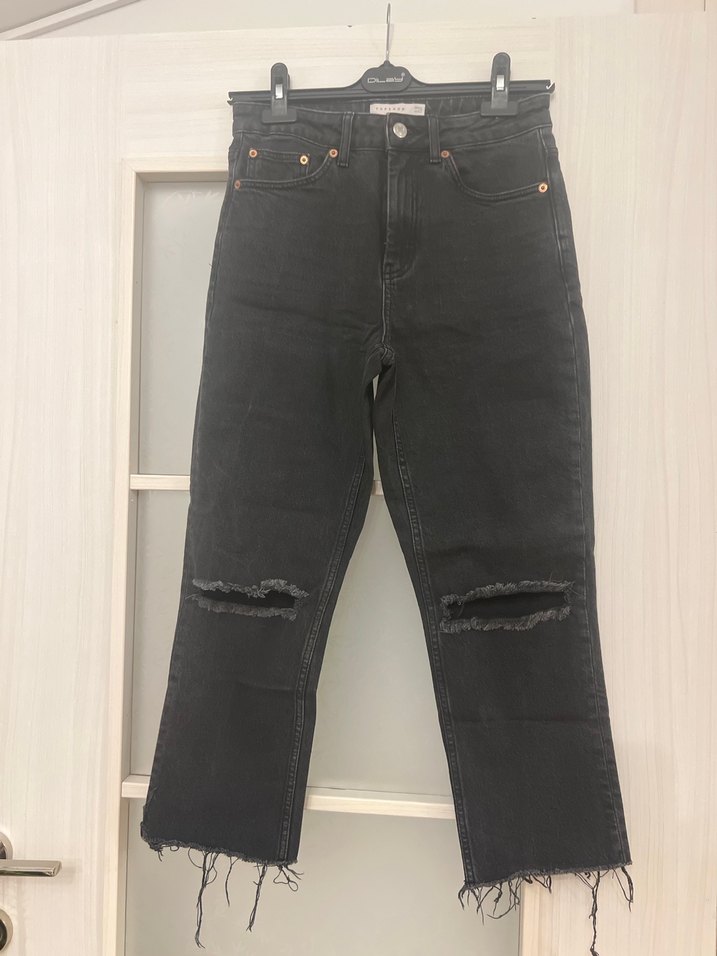 Siyah kot pantolon, regular fit ve midi boy. Yırtık diz detayları ve tokalı tasarımıyla sokak stiline uygun, trend rahat bir model.