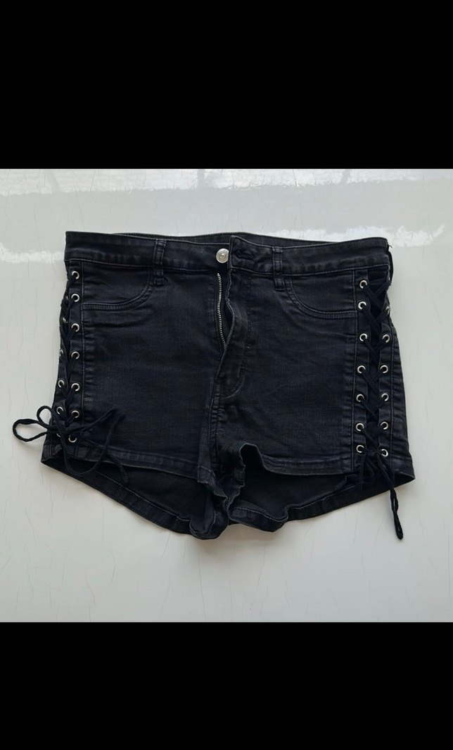 Yanları çapraz ip detaylı, elastik bir kot kumaşı yumuşak doku, , H&M marka, 42 beden, yüksek bel, 2. El, iyi durumda. Beli sağdan sola 39 cm, boyu 36 cm’dir. yanlarda bağcıklı detaylara sahip, sıkı kesim siyah kot mini şort. Rock punk havası için uygun, dış mekan kullanımı için ideal.